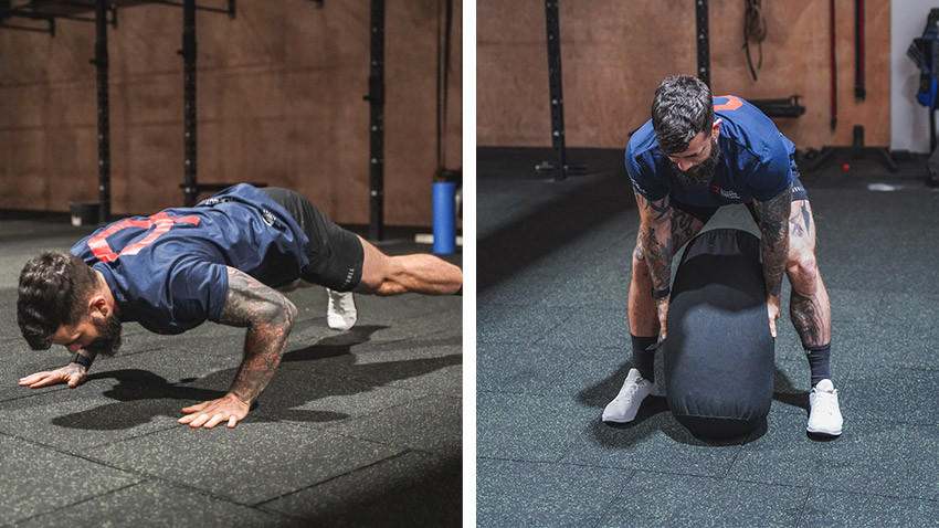 Part 1: In pairs, 10 rounds of sandbag runs (30kg). Complete one length, then perform 20 jumps over the sandbag before running back.
