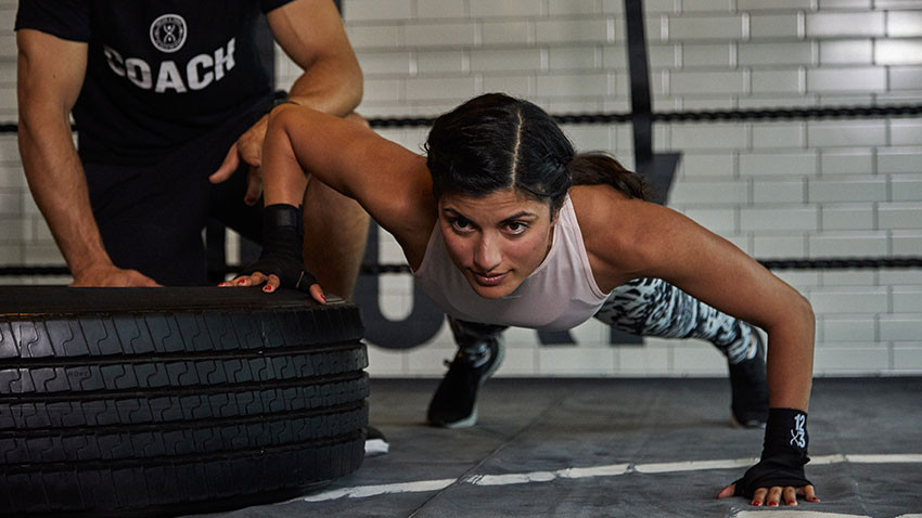 For block one you may be on the mat doing thrusters and renegade rows, then, when the bell rings, you quickly move around to bag work or – and we can only sympathize with you here – a calorie burn on the assault bike.